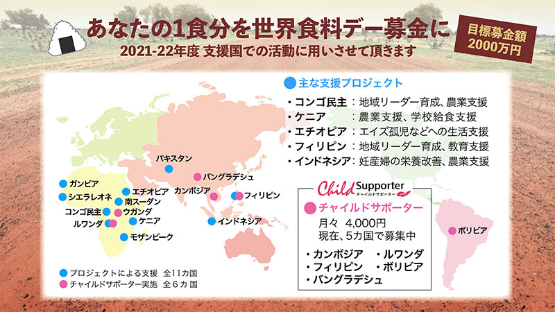 2021年の世界食料デー募金は目標2000万円です。(期間:2021.7~2022.6)